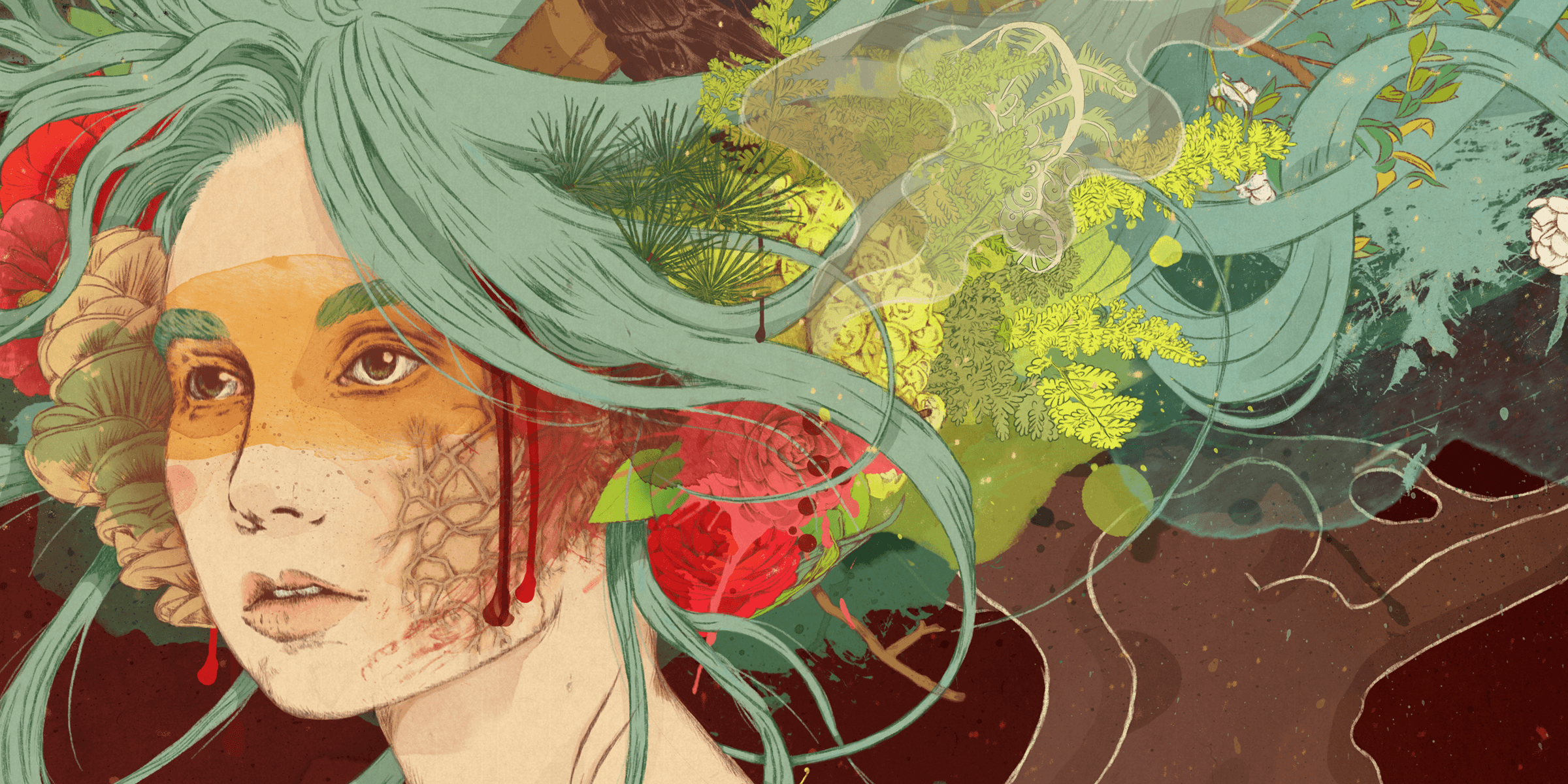 The illustrations combine graphite sketching, digital color work, and scanned watercolor stains, which are strategically placed to emphasize key areas, enhance the organic feel, and reinforce the surrealist style.