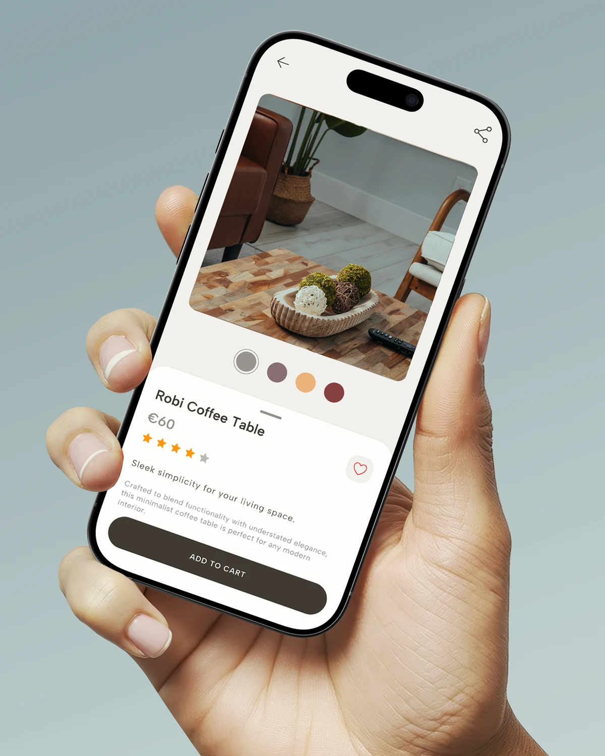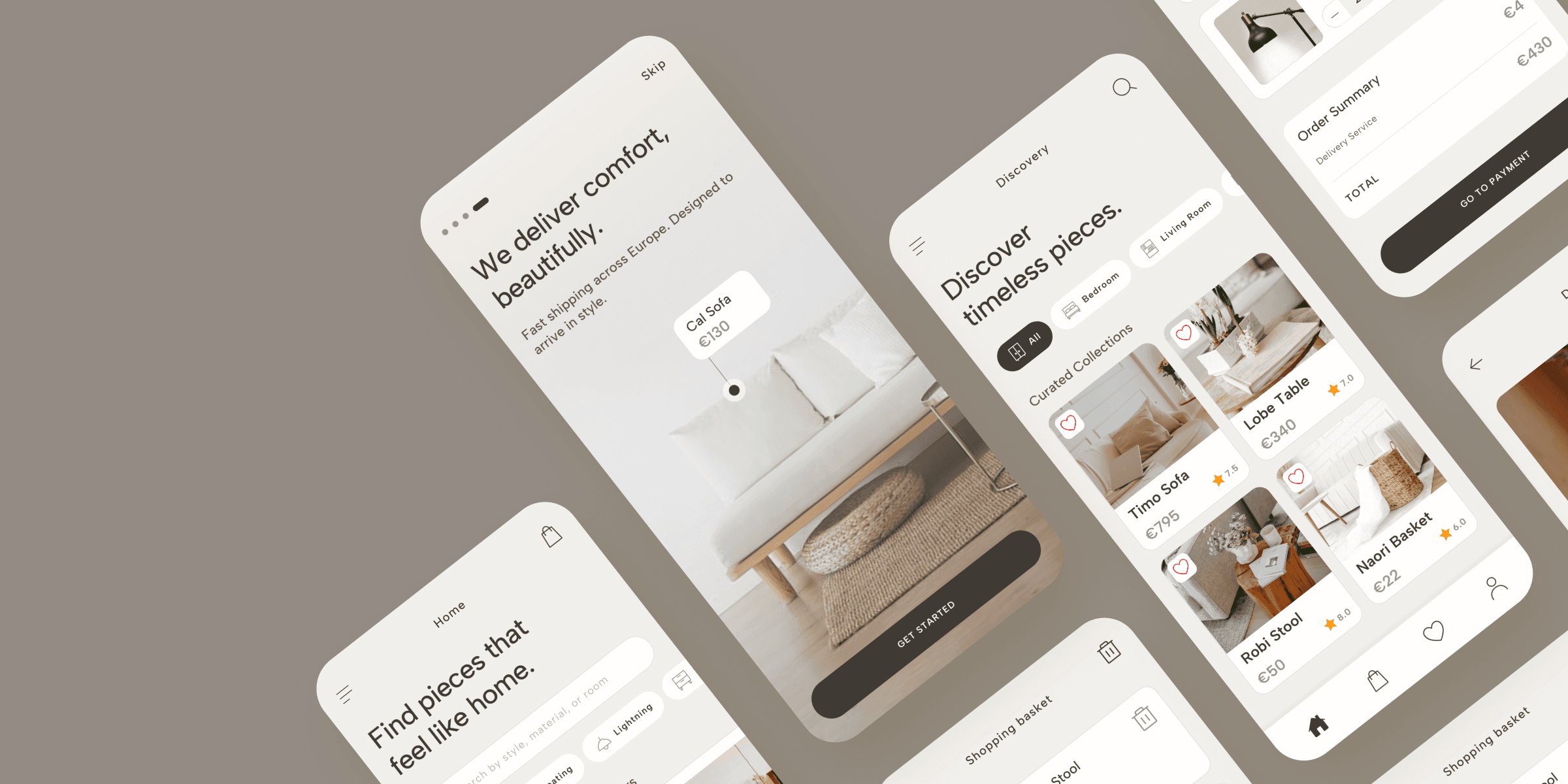 The experience includes a soft onboarding flow with warm messaging, a catalog organized by room and material, a thoughtfully designed shopping cart, and a discovery section that encourages inspiration and exploration.
