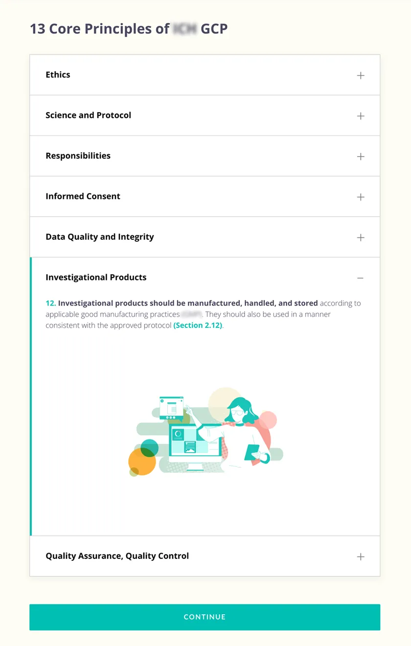 The IQVIA Good Clinical Practices (GCP) E-Learning Design System was developed to support nine interactive courses for IQVIA’s 87,000 employees across more than 100 countries. The initiative focused on transforming dense regulatory content into a compelling digital learning experience by establishing a scalable, reusable design system within a strict three-month deadline. Working collaboratively with internal stakeholders and the creative team, the visual direction and illustration guidelines not only brought consistency to the training program but also influenced IQVIA’s broader design language.