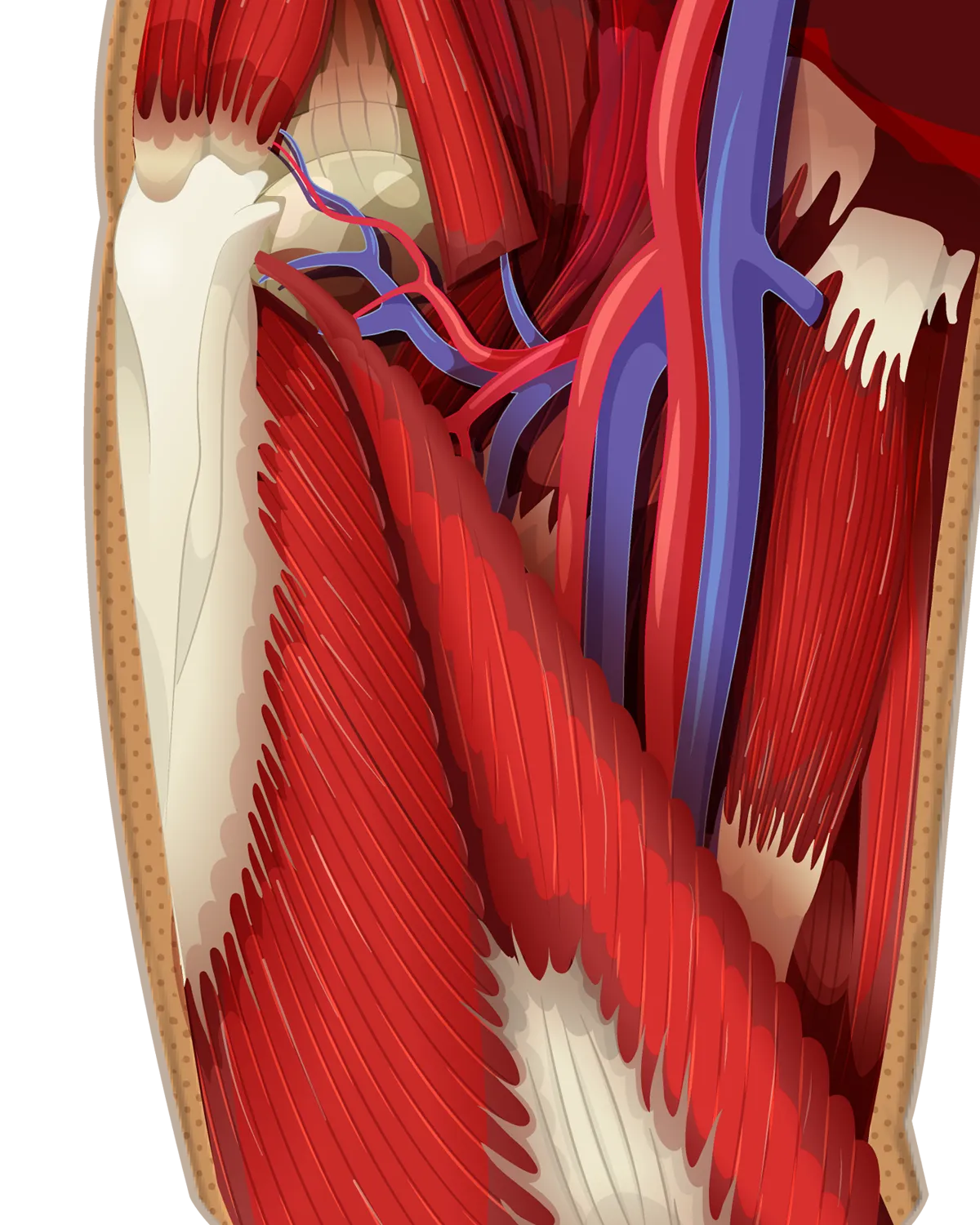 Vector illustration of the leg’s muscular and vascular system, designed for clinical trial materials.